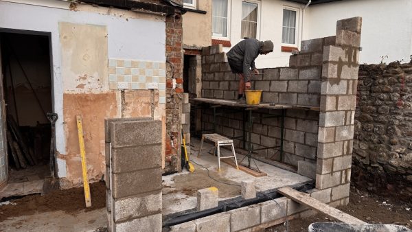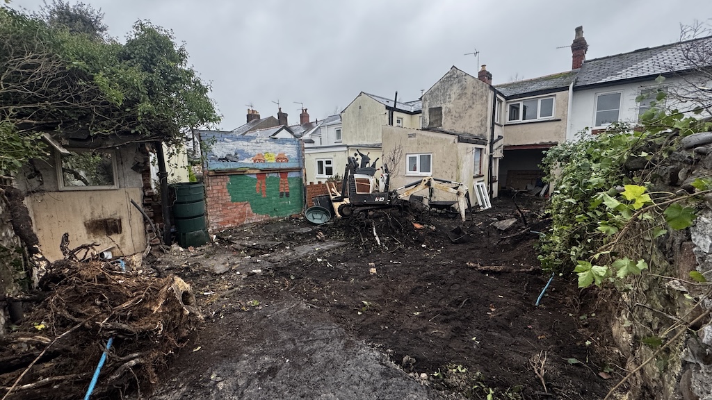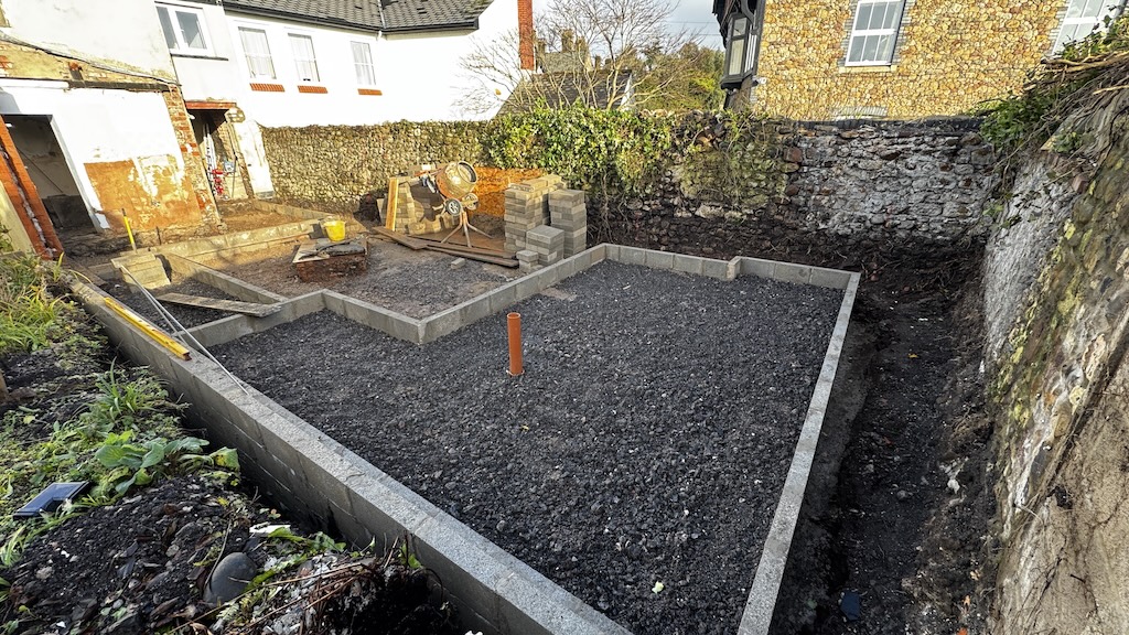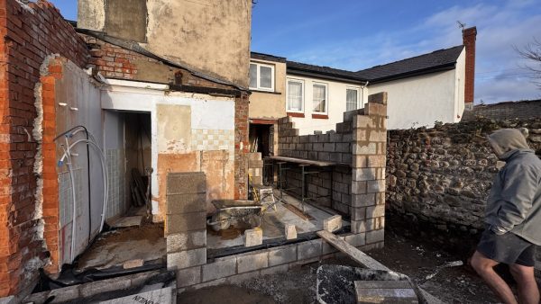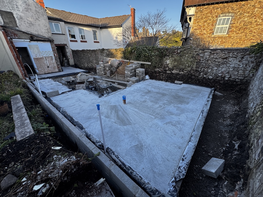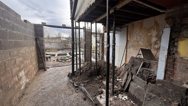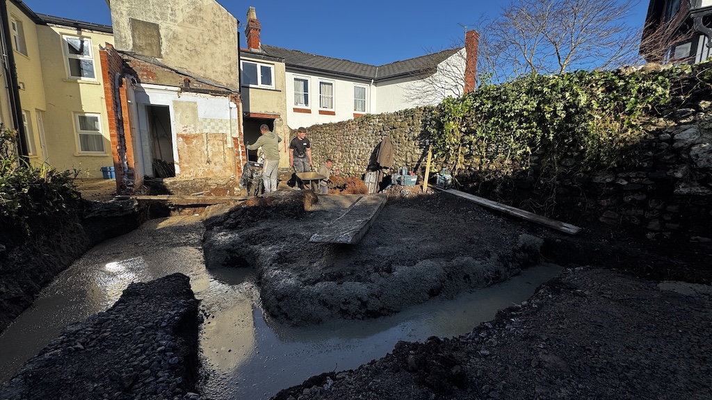 The initial challenge was to prepare the ground. A big part of this was taking down a large, dilapidated outhouse and rebuild it as a third bedroom with bathroom. We also had to prepare for a kitchen extension. This initial groundworks phase left us taking out 130 tonnes of soil, building materials and garden waste. We then poured 9 cube of concrete foundations before preparing for drainage, waste and the floor slabs. We have completed this phase.